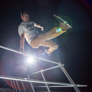 Je souhaite qu'il adopte une posture qui fasse illusion de défier la gravité, tout en rusant de mon flash. Les éléments sont tous réunis, je veux éviter trop de post production, pour un effet authentique, le défi est donc de déclencher au bon moment afin de capturer le cliché. 1 flash, 1 perche, 1 fumigène, un athlète patient et ouvert d'esprit sont fin prêts afin de satisfaire mon imagination, il n'aura pas fallu beaucoup de prises et déclenchement et tant mieux parce que je n'avais qu'un seul fumigène et la fumée se disperse vite.